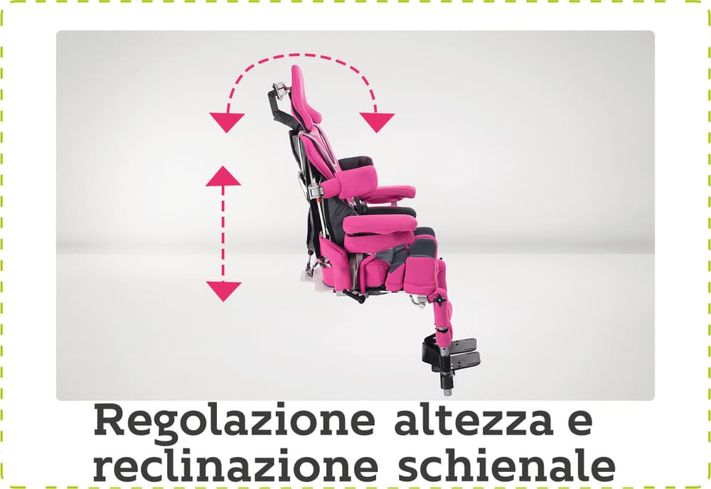 • Seduta regolabile in larghezza, profondità, adduzione, abduzione oltre che in situazioni di asimmetria;